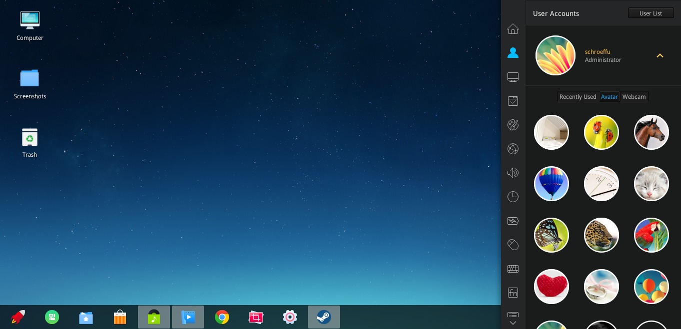 Einmal umgestellt wirkt Deepin sehr elegant. Diese Eleganz zieht sich auch durch die Icons und die Menüführung hindurch. Die Menüführung ist erfrischend anders: Mit einem Klick auf das Einstellungs-Icon schieben sich die Einstellungen von Rechts in den Bildschirm hinein. Diese Handhabung wirkt einfach und durchdacht, es dürfte ein Vorteil sein ploppt kein zusätzliches Fenster auf dafür.