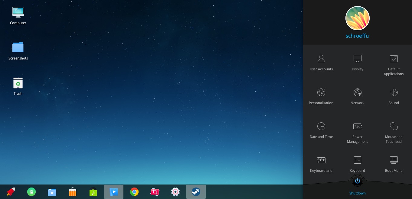 Auffallend ist die funktionierende Integration der Programme in die Taskbar. Ein Beispiel: Während viele Distributionen sich schwer tun ein Steam-Icon in die Taskbar aufzunehmen, ist das vorinstallierte Steam gleich nach dem Start korrekt platziert neben der Uhr unten rechts.
